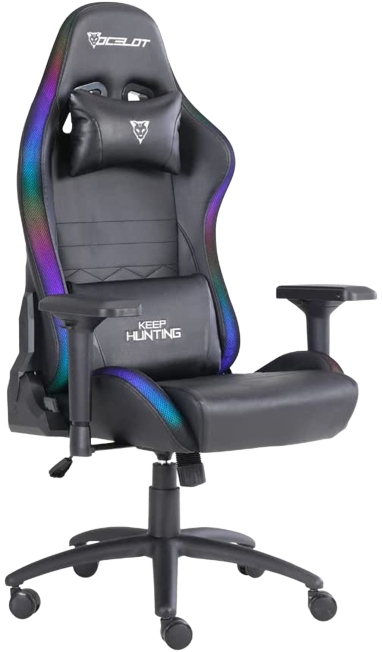SILLA GAMER OCELOT GAMING RGB / BASE AJUSTABLE DE METAL / DESCANSA BRAZOS AJUSTABLES DE 4 DIMENSIONES / ANGULO DE INCLINACION 155 GRADOS/ SOPORTA HASTA 150KG/ COJIN DE DESCANSO LUMBAR Y CERVICAL